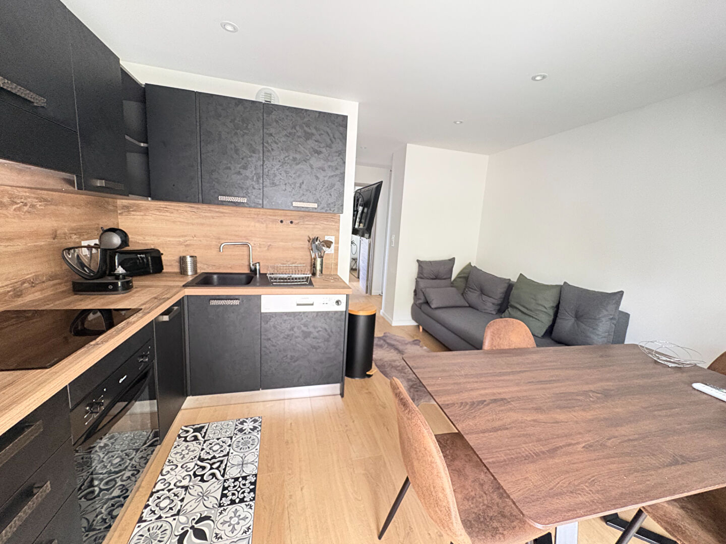 - Un séjour lumineux avec cuisine ouverte, aménagée et équipée ;